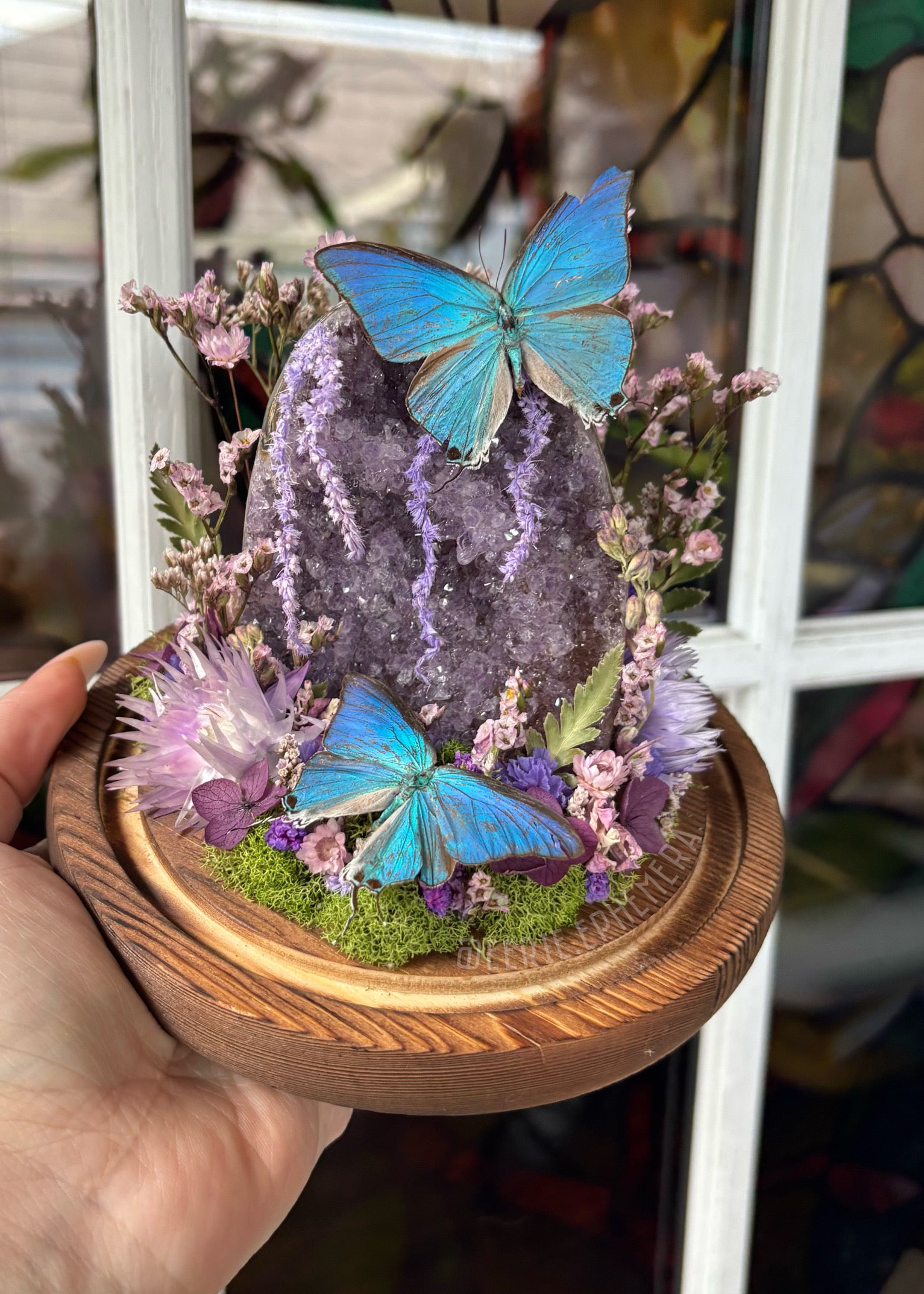 Two hairstreak butterflies on a purple amethyst cubase surrounded by dried florals