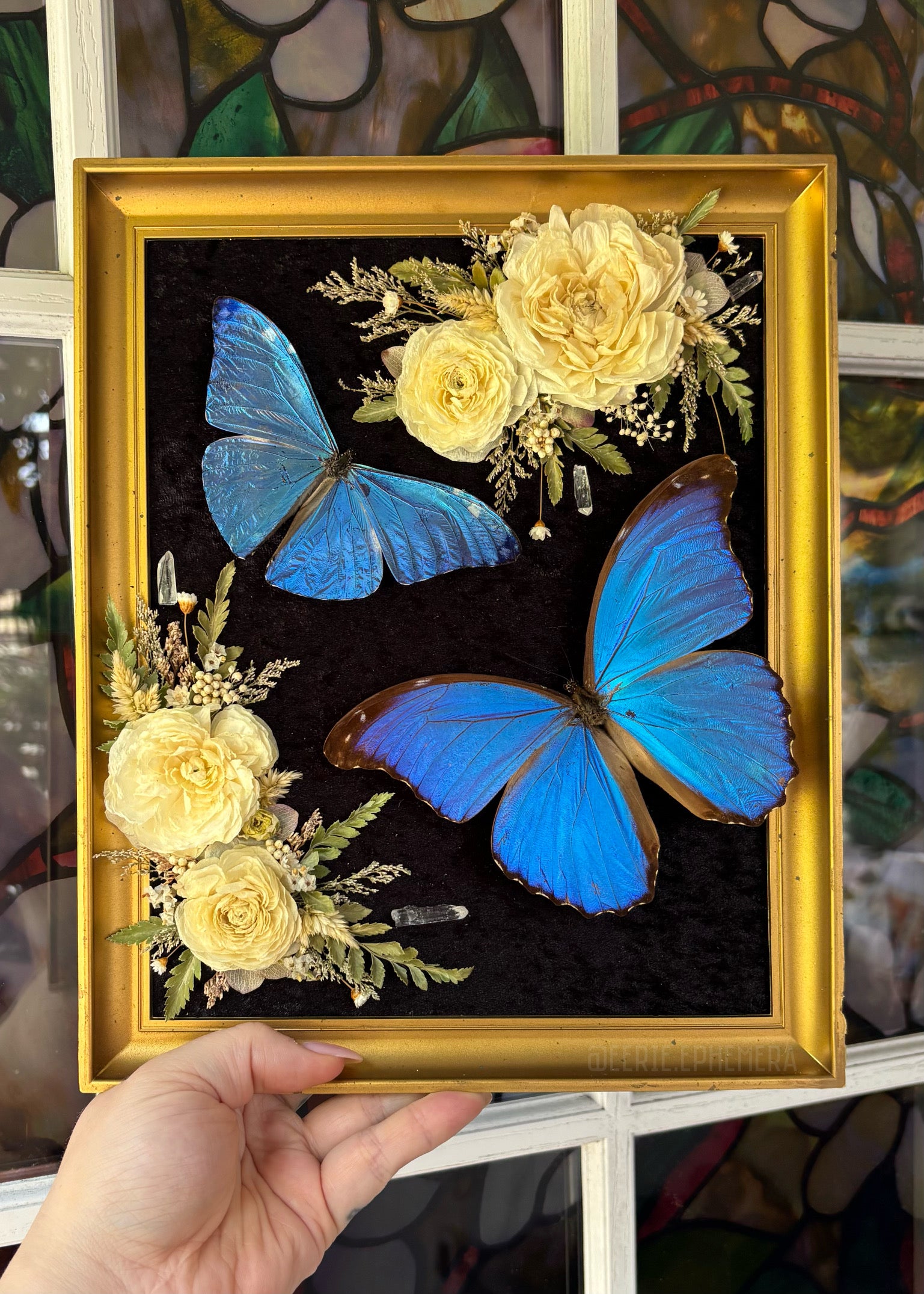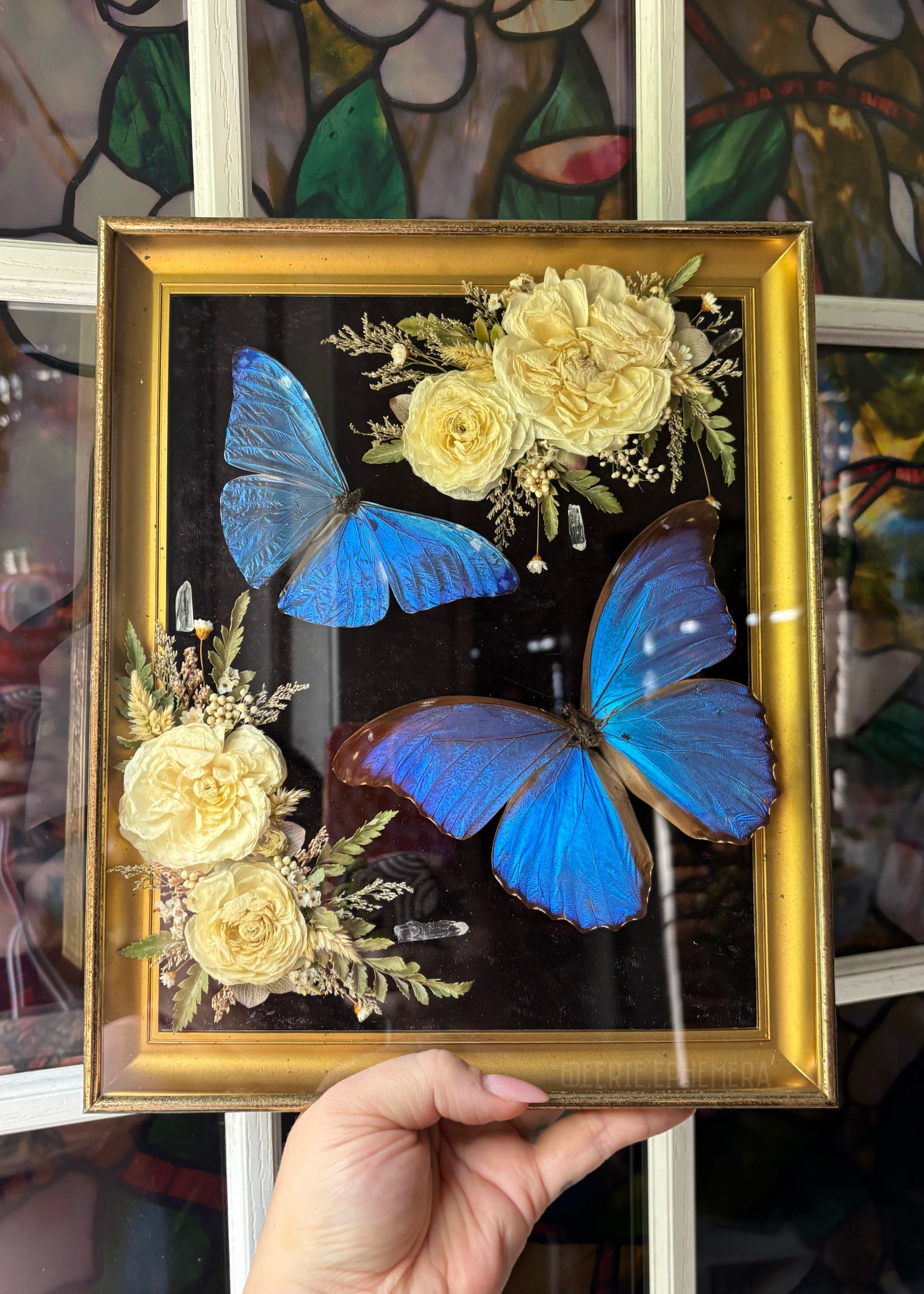 A Morpho Didius, a Morpho Adonis, dried florals, and clear quartz points in a 9x11 vintage MCM frame