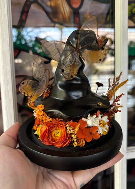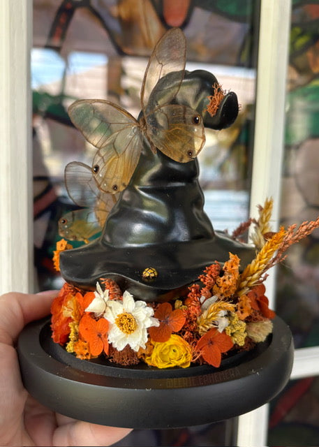 Two Amber Glassing butterflies and a Netty Ladybird on a cute witch hat surrounded by dried florals