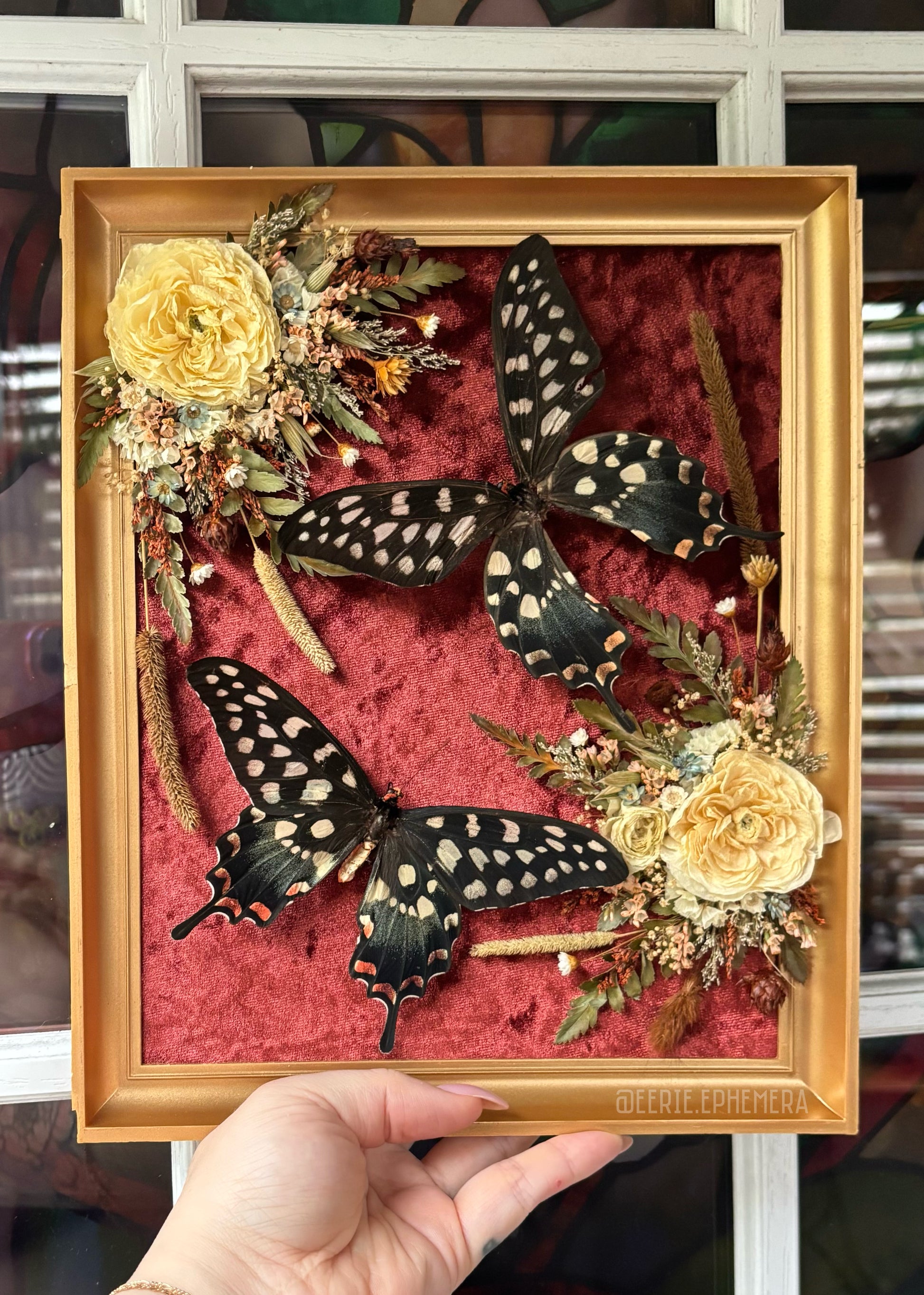 Giant Madagascar Swallowtails on rust colored velvet with dried florals in a vintage 9x11 MCM frame