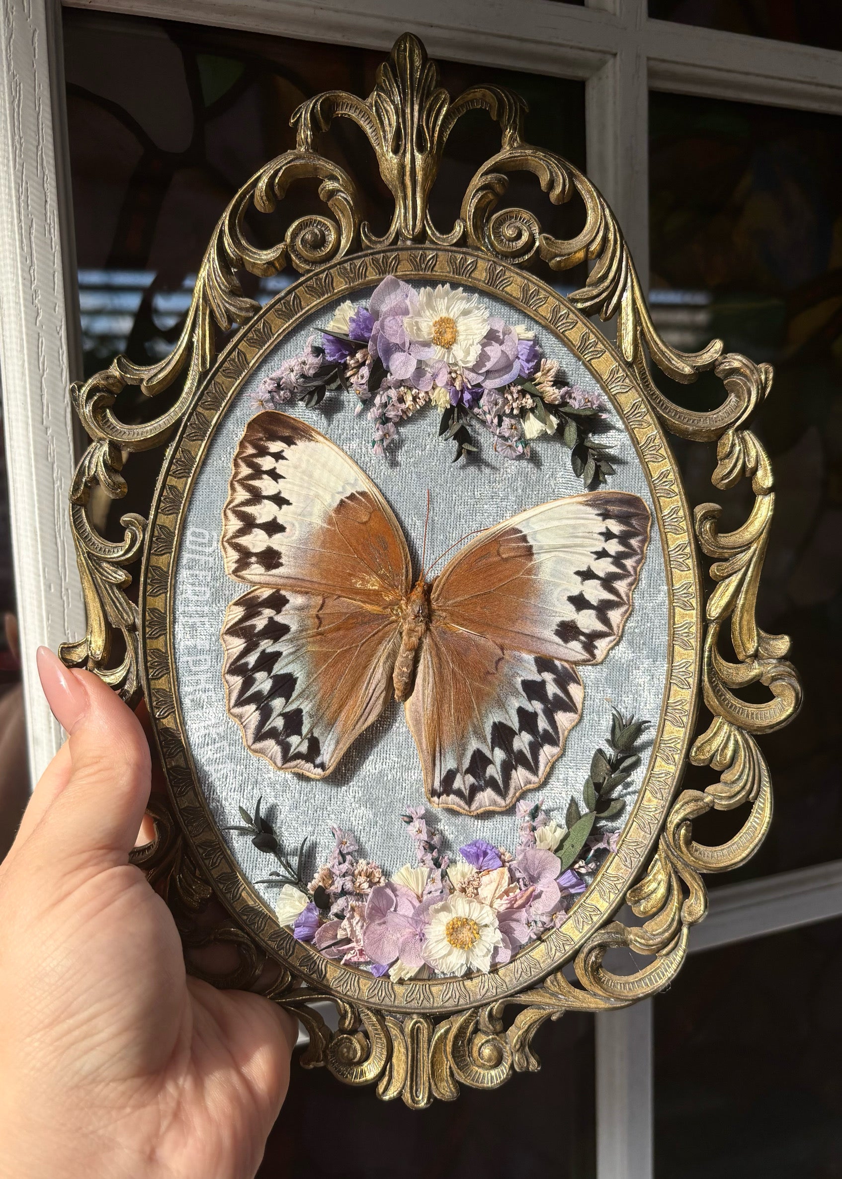 Uemura's Jungle Queen butterfly on baby blue velvet with dried florals