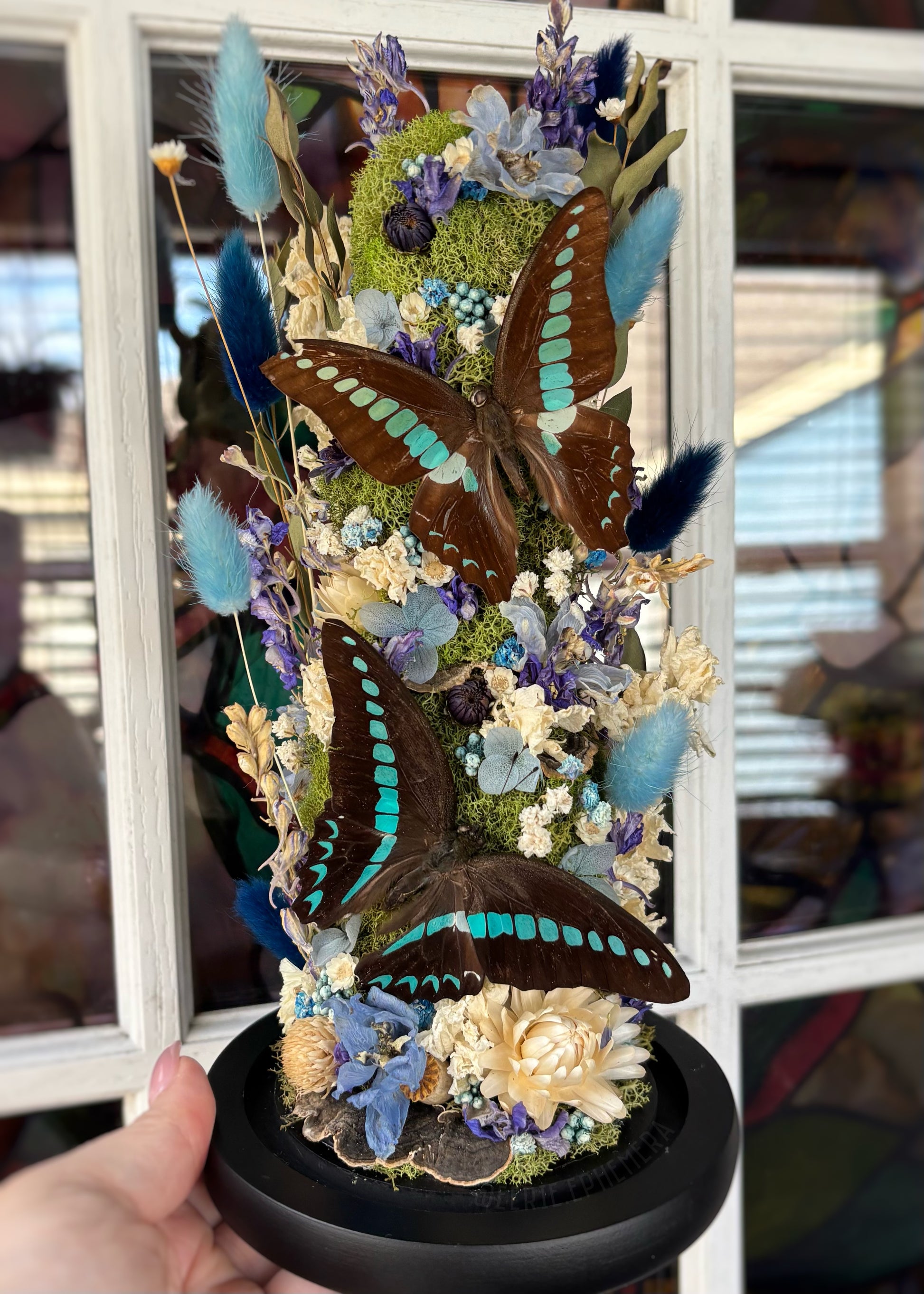 Blue Bottle Butterflies in a 10” cloche with blue and white florals